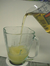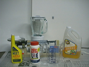 What is biodiesel? Simply put, it is diesel fuel that is made from vegetable oil. It will run in any unmodified diesel engine. It has many advantages over petroleum diesel fuel such as: 1) It burns cleaner 2) It has a higher cetane rating (less knocking) 3) It has better lubricity 4) You can make it yourself from used vegetable oil (a waste product) often for less than the cost of petroleum diesel. How to make your first batch of biodiesel: Note: This recipe is for "new" oil only. For a recipe for used vegetable oil, see Journeytoforever.org You will need the following things to make your first batch: 1) At least 1 Litre (1.1 Quart) vegetable oil. Canola oil, corn oil, soybean oil, etc will suffice. 2) A variable speed blender with a slow speed option. Use one with a glass pitcher only. The methanol that is used in this process will "eat" a plastic pitcher. Make sure that this blender will never be used for food products again. 3) A scale that will accurately measure 3.5 grams (.12 oz). Search Ebay for "digital scale". A good one should cost about $20. 4) 1 bottle Red Devil Lye Drain Cleaner (Sodium Hydroxide) available from you local hardware store. Make sure the label says "contains sodium hydroxide". Most other drain cleaners are chlorine (Calcium Hypochlorite) based and will NOT work! Notice: Lye is poisonous! Take all necessary safety precautions!! 5) At least 200 milliliters (6.8 fl. oz) of methanol (Methyl Alcohol or "Wood" Alcohol). Methanol is widely available in 12 oz. quantities as "gas tank antifreeze" in auto parts stores, hardware stores and even some grocery stores. Popular brands include "Heet" and "Pyroil". Read the label carefully and make sure it says "contains methanol"! Many gas line antifreeze products contain isopropyl alcohol or "isopropanol" and will NOT work! Methanol is available in larger quantities as racing fuel through some racetracks that cater to drag racers and some "high performance" auto parts stores. Keep in mind that Methanol is both poisonous and flammable. Take all necessary safety precautions!! 6) A glass container that is marked for 200 milliliters (6.8 fl. oz). We like to use a beaker. 7) A glass or plastic container that is marked for 1 liter (1.1 Quart) 8) A wide mouth glass or plastic container that will hold at least 1.5 litres 9) A common spoon (preferably plastic or stainless steel). 10) Safety Glasses and Rubber Gloves! Methanol and Lye are extremely poisonous and must not come into contact with skin or eyes! Methanol is a poison that attacks the eyes (ocular nerves) even if it comes into contact with your hands. Use extreme care when blending the methanol and lye, as the blender can spash the chemicals around. Put on your glasses and gloves BEFORE opening the chemicals! Do your work close to a sink or hose, or have a bucket of water handy to wash any part of your body immediately if it comes in contact with these chemicals.