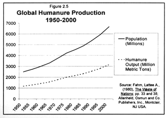 If we had scraped up all the human excrement in the world and piled it on the world’s tillable land in 1950, we’d have applied nearly 200 metric tons per square mile at that time (roughly 690 pounds per acre). In the year 2000, we’ll be collecting significantly more than double that amount because the global population is increasing, but the global land mass isn’t. In fact, the global area of agricultural land is steadily decreasing as the world loses, for farming and grazing, an area the size of Kansas each year.17 The world’s burgeoning human population is producing a ballooning amount of organic refuse which will eventually have to be dealt with responsibly and constructively. It’s not too soon to begin to understand human organic refuse materials as valuable resource materials begging to be recycled.