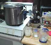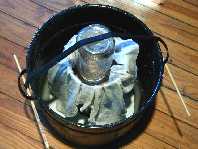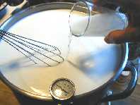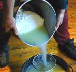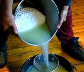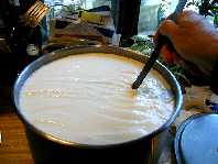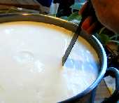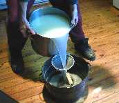 1.a. Sterilize the pot: The evening before you plan to make cheese, place a small amount of water in your cheese pot, cover, and heat to boiling for 10 minutes to sterilize the pot and lid. 1.b. Warm 5 gallons of milk to 20°C (68°F) in a sterilized pot: skim the cream off of five gallons of the freshest milk (save for ice cream ). Warm the milk to 20°C (68°F) slowly so as to not scorch the bottom).  |