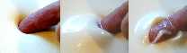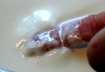 7.  TEST FOR A "CLEAN BREAK."   THIS IS NOT A "CLEAN BREAK": To test for "clean break" (completed action of rennet), probe a clean finger into (hopefully) gelled milk and lift. If the gelled milk is not firm enough to split cleanly as you lift, let milk sit until clean break is obtained. (Do not stir.) This may take as long as 3 hours. Be patient, do NOT disturb the milk. Keep warm. Here is a page to help you diagnose the problem of inability to get a clean break.  |