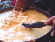 Separate the curds from the whey: Let the "cooked" curds sit for a few minutes. The curds should sink in whey. [If the curds float , you have a gas-producing contaminant in your starter. It does not necessarily ruin the cheese, indeed, you might WANT bubbles in your finished cheese. Butfloating curds are more difficult to separate from the whey than sinking curds.] Decant off whey through a strainer (you may line the strainer with clean cloth if the curd is very fine grained).  |