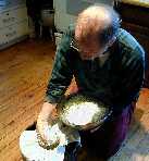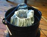 Remove the cheese, wrap in sterile bandage: The next AM, remove from press, remove cloth, rub outside of cheese with salt and wrap with fresh sterile handkerchief "bandage."  |   |